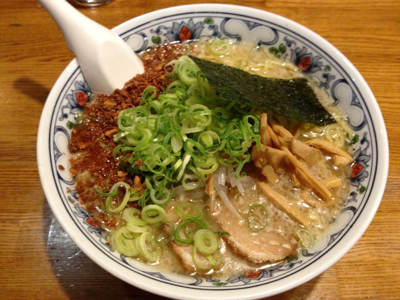 背脂が入り、焦がしニンニクが振りかけられて