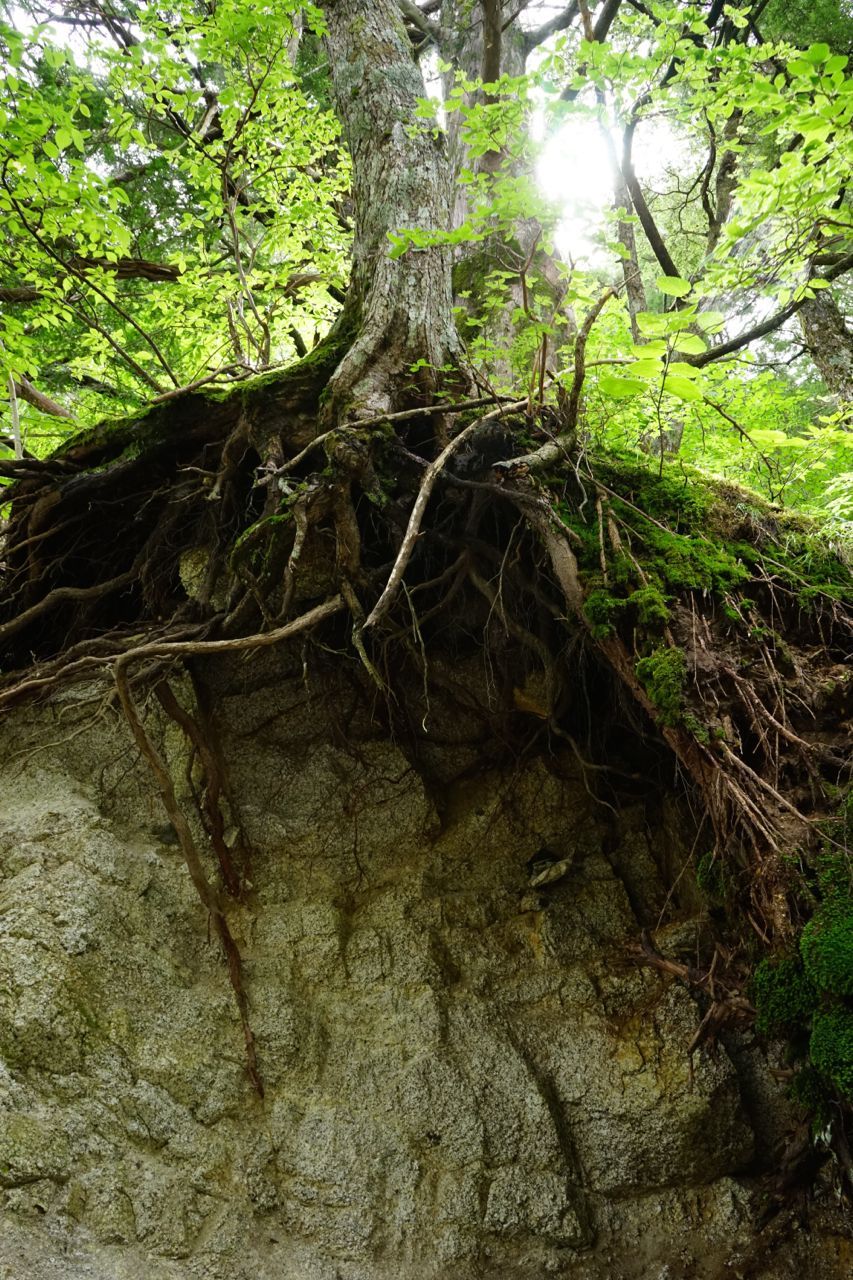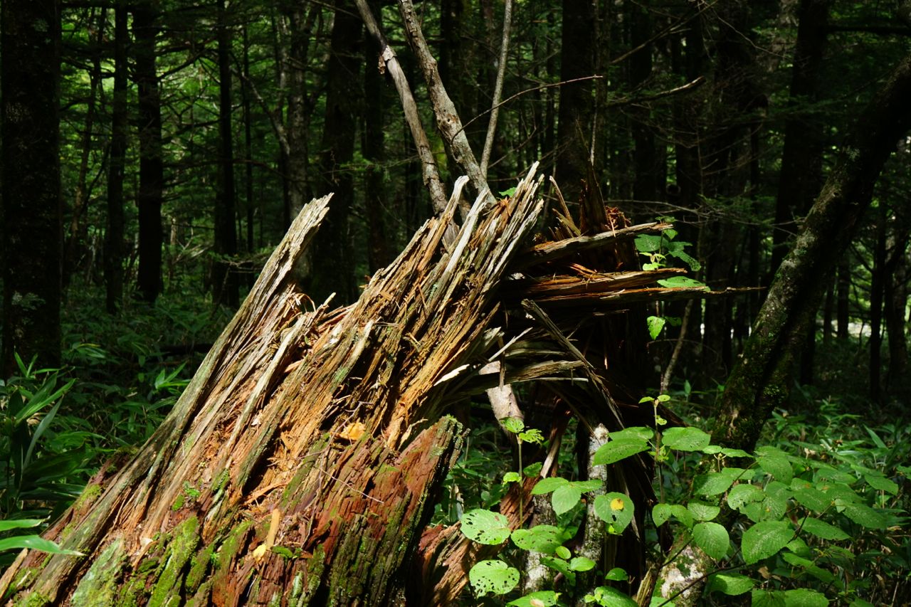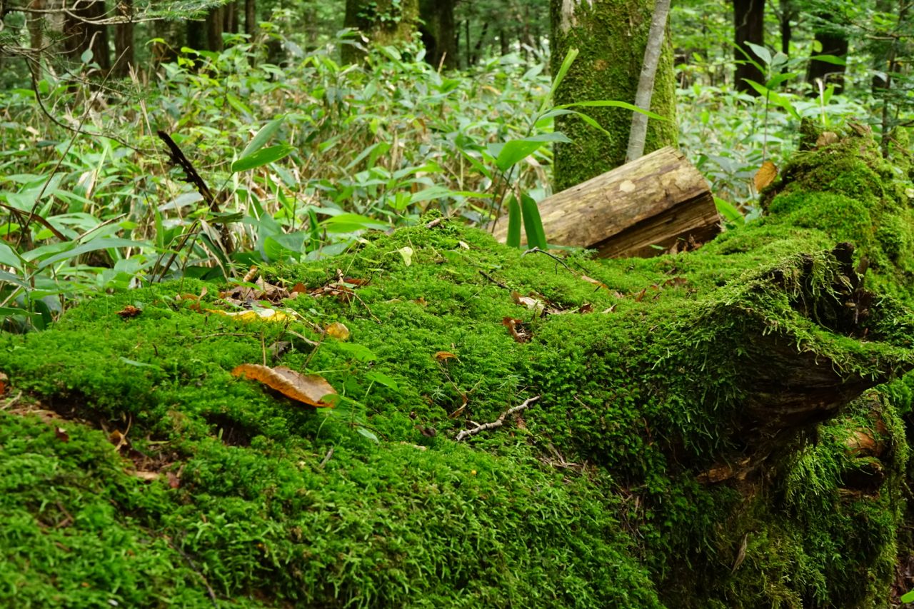 折れた樹木の上のコケが美しく、そこからまた新しく植物が育つ…