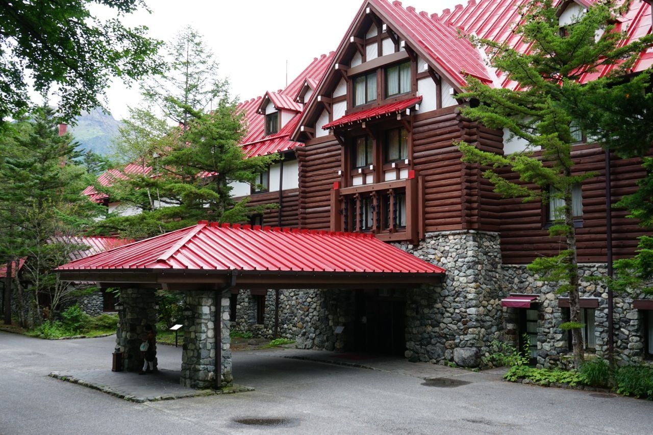 上高地の森のなかに建つ赤い屋根。なんとも歴史がありそうな雰囲気。
