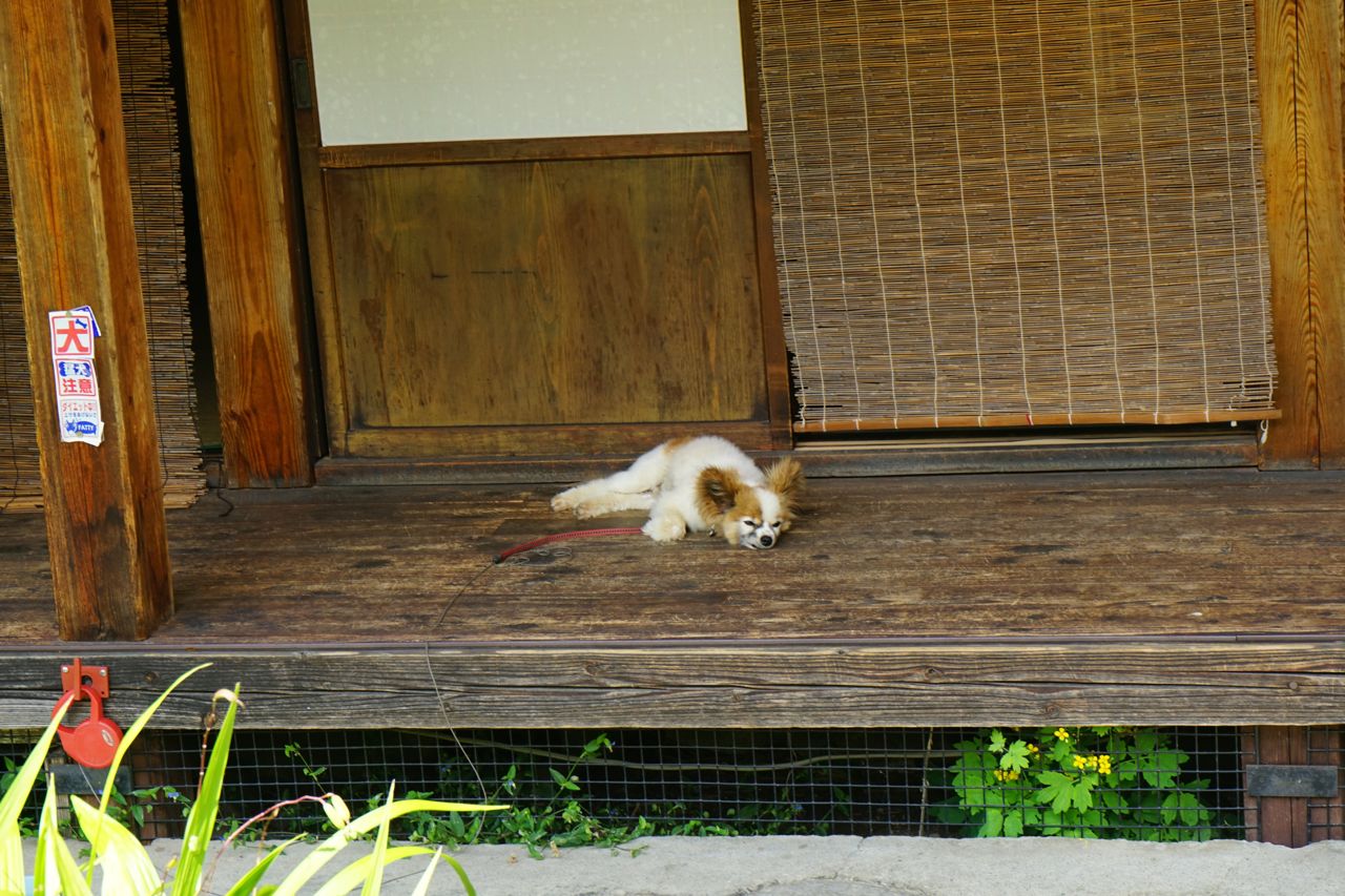 集落内の民宿で見かけた、涼しい縁側で寝る犬。