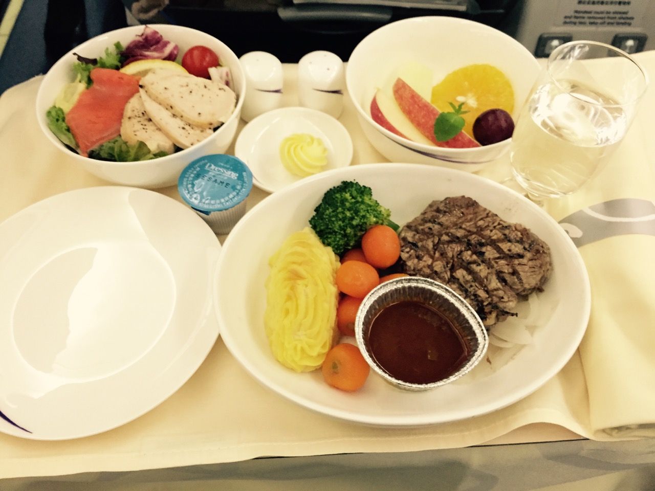 機内食はビーフを選択。ここでもシャンパンをお替り。