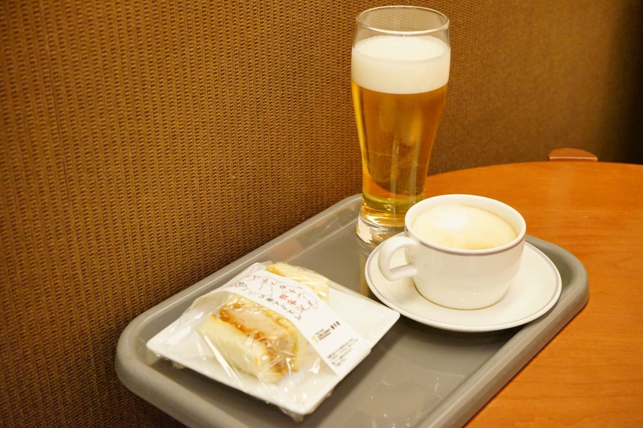 朝から生ビールとカツサンドで乾杯。