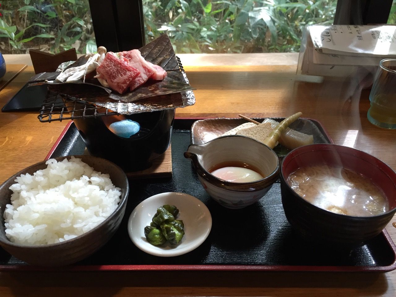 お昼ご飯にはお食事処で飛騨牛入りの朴葉味噌焼きをいただきました。