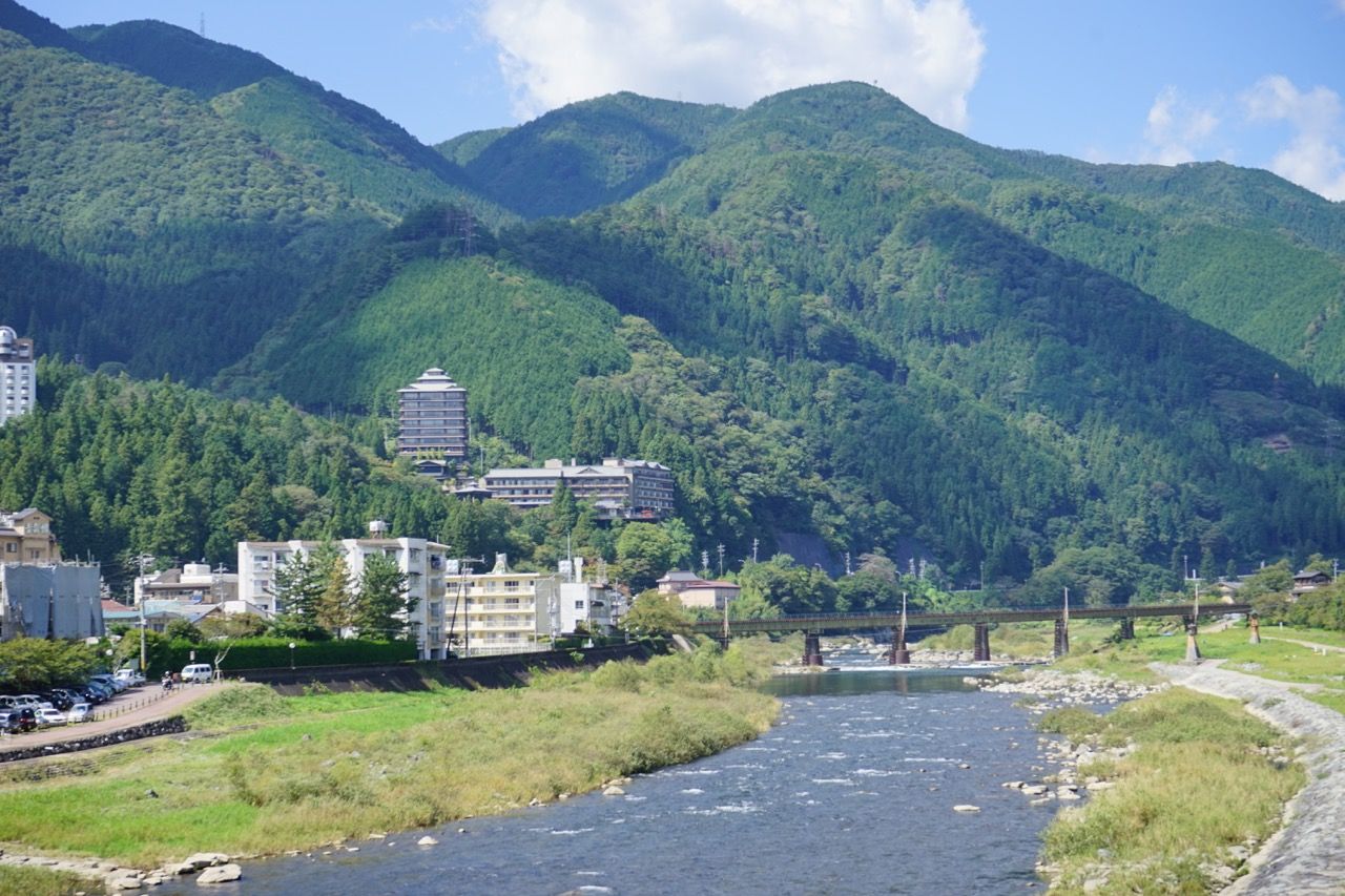雄大に流れる飛騨川。川にある温泉が有名ですね。