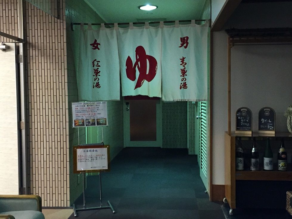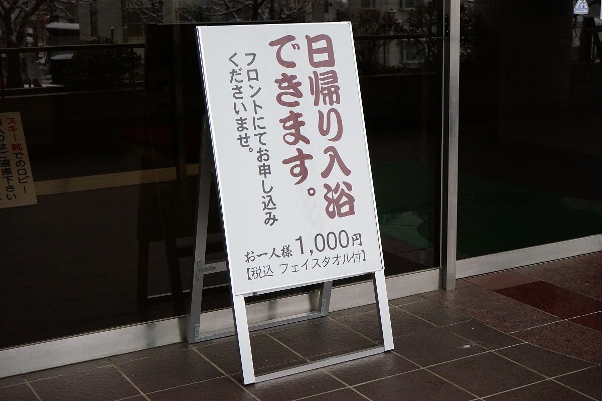 ホテル前には"日帰り入浴できます"の看板が。