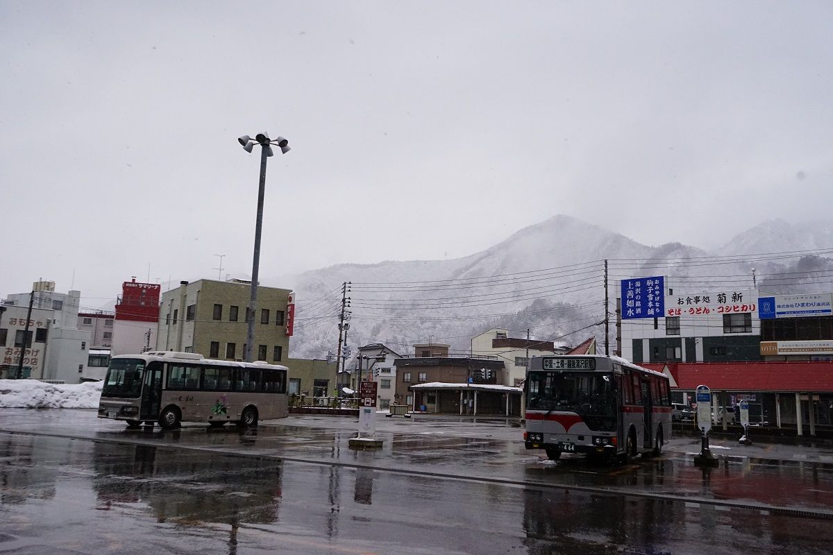 トンネルを出ると雪景色に変わり越後湯沢駅前は辺り一面もう真っ白。