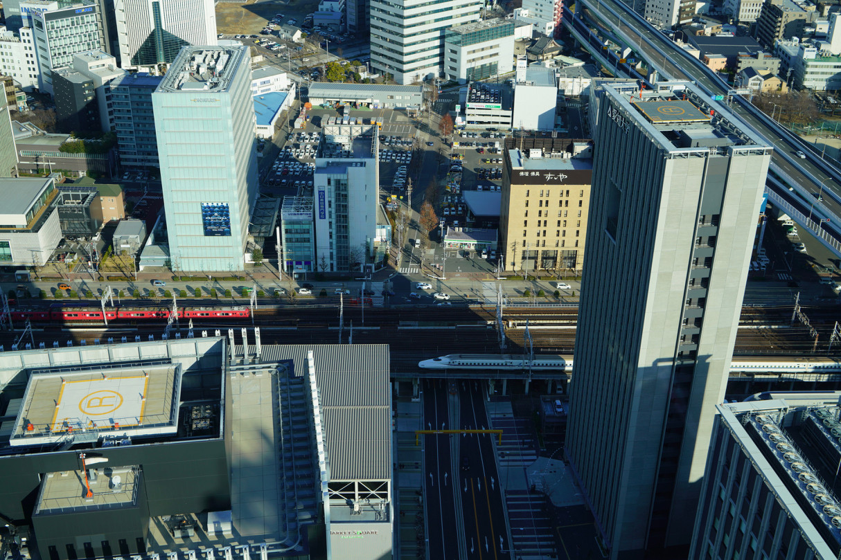 窓の下には新幹線、名鉄、東海道線が見えて