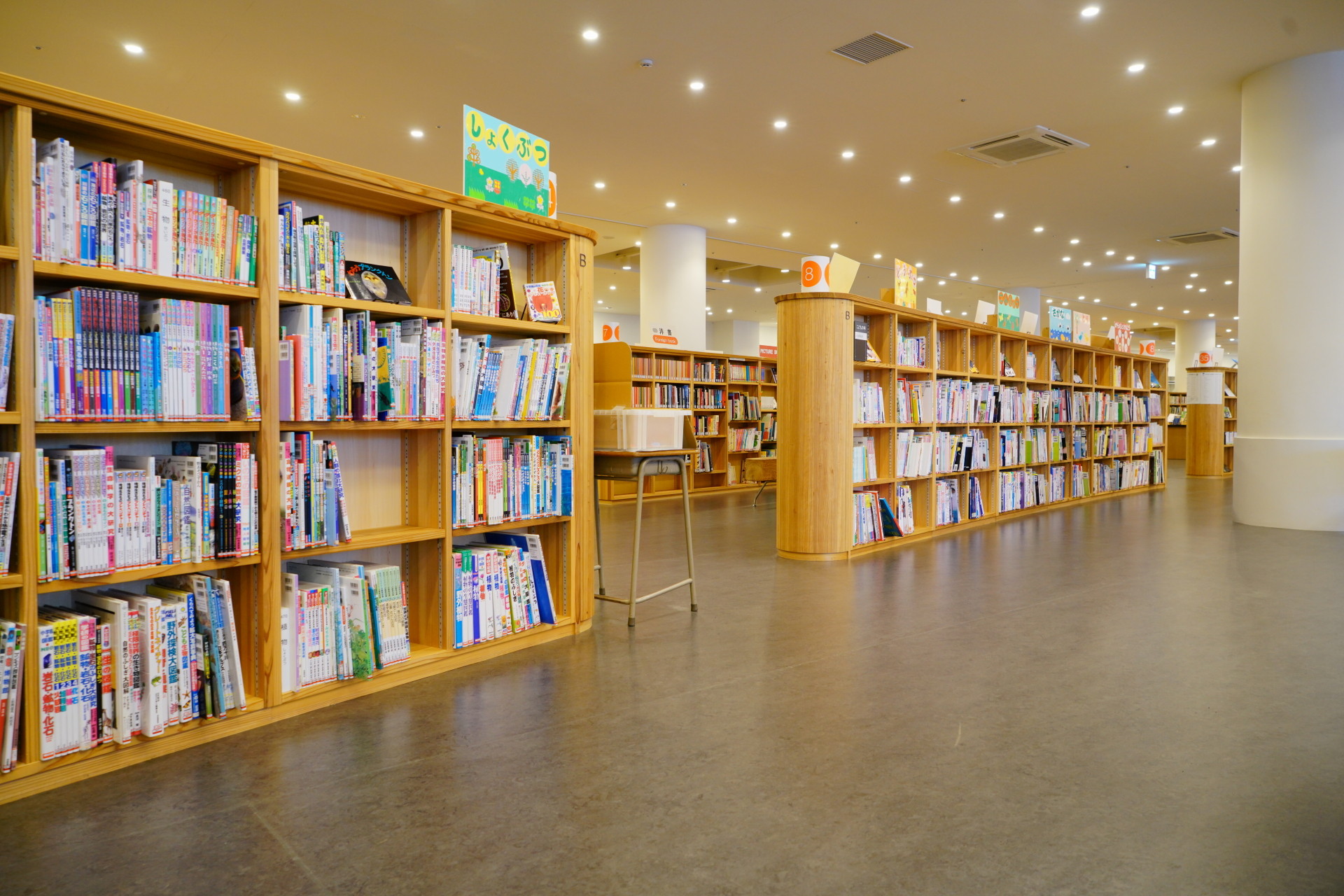 天然木で作られた本が沢山並んでおり、