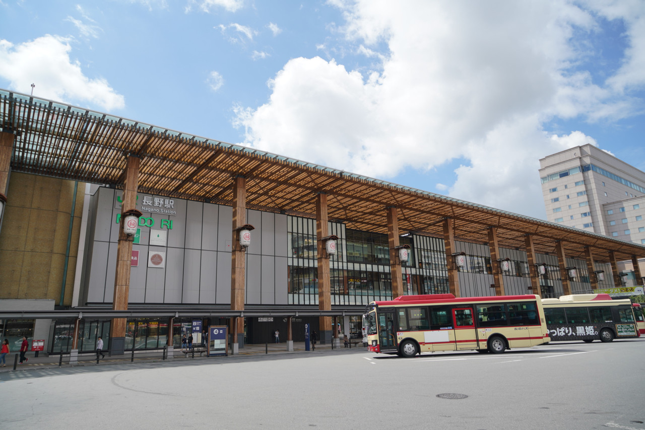 朝の長野駅に到着。多くのバスが行き来して、