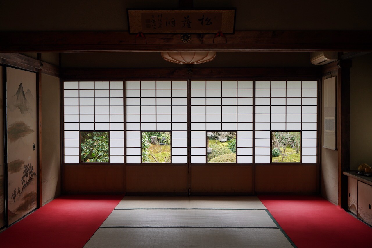 各窓から椿や灯籠、楓、松が