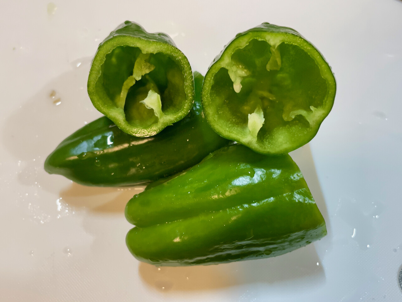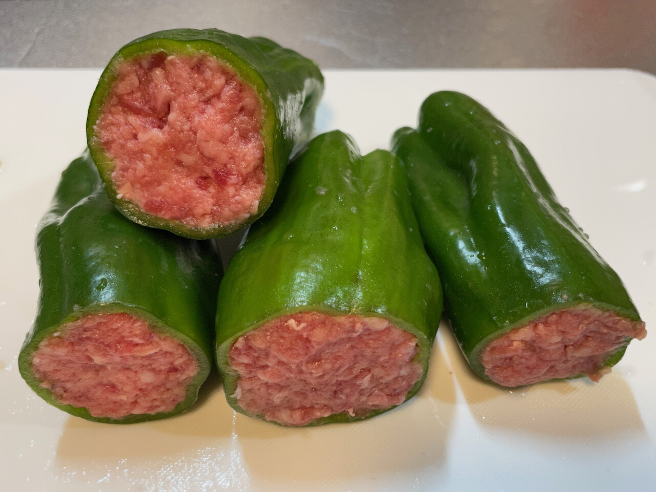 60年前くらい、母親が作るピーマンの肉詰めは、横に3分割でした。真ん中部分は、 両面とも肉だし、ピーマン要素が若干少ないために兄弟で取り合いでした。