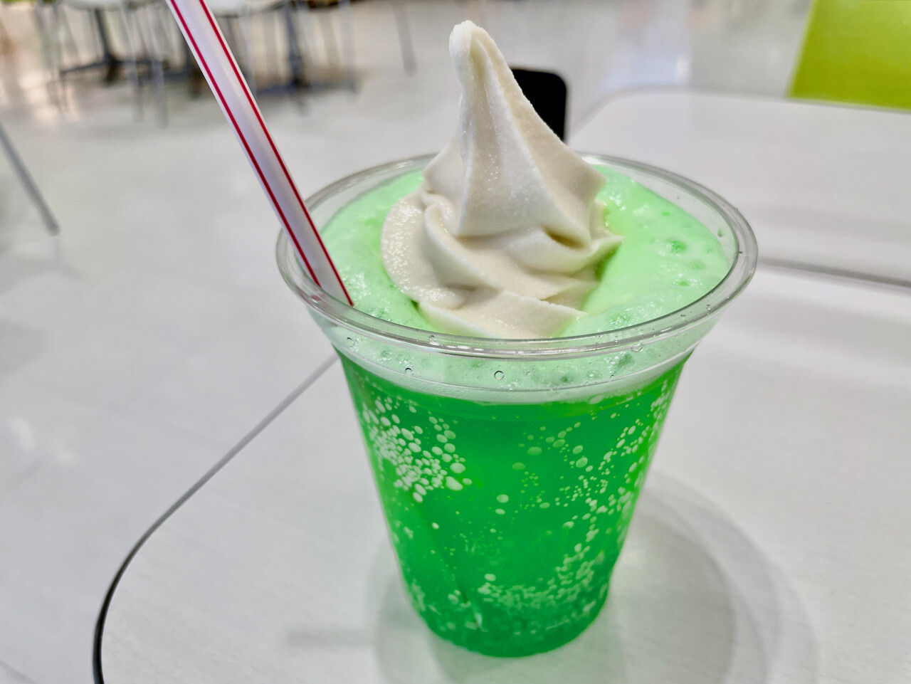 メロンソーダにソフトクリームがのると、