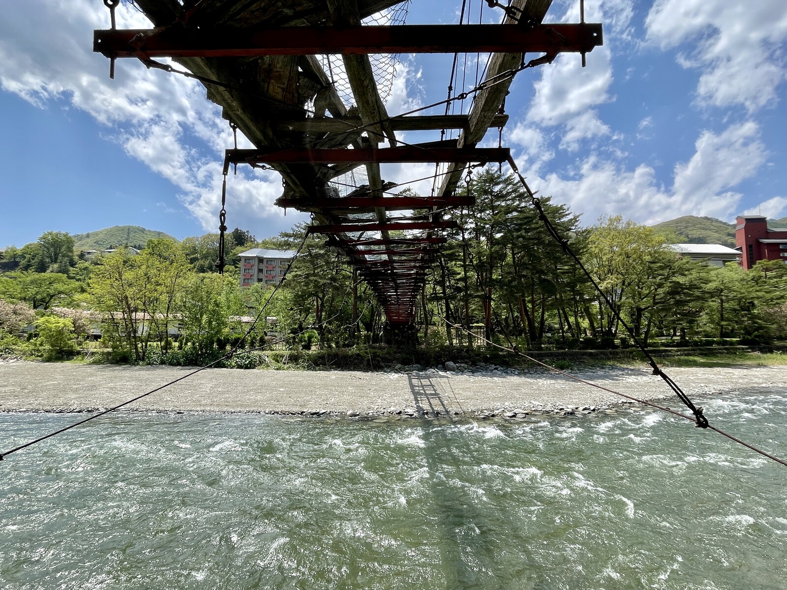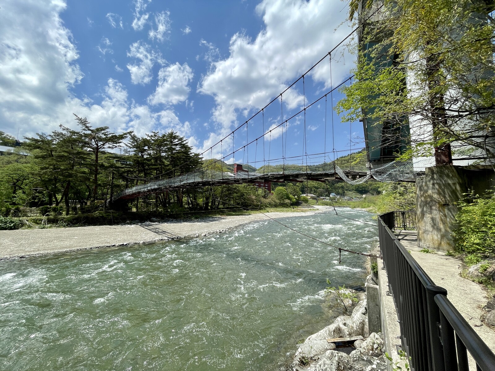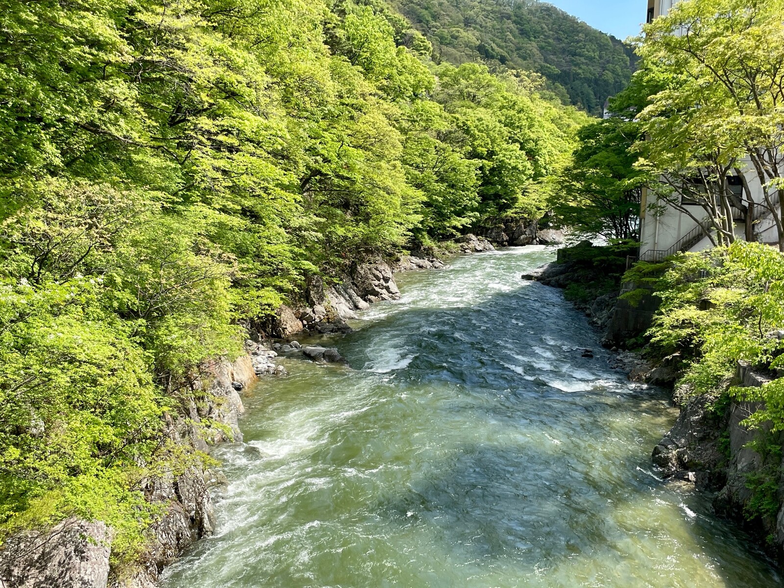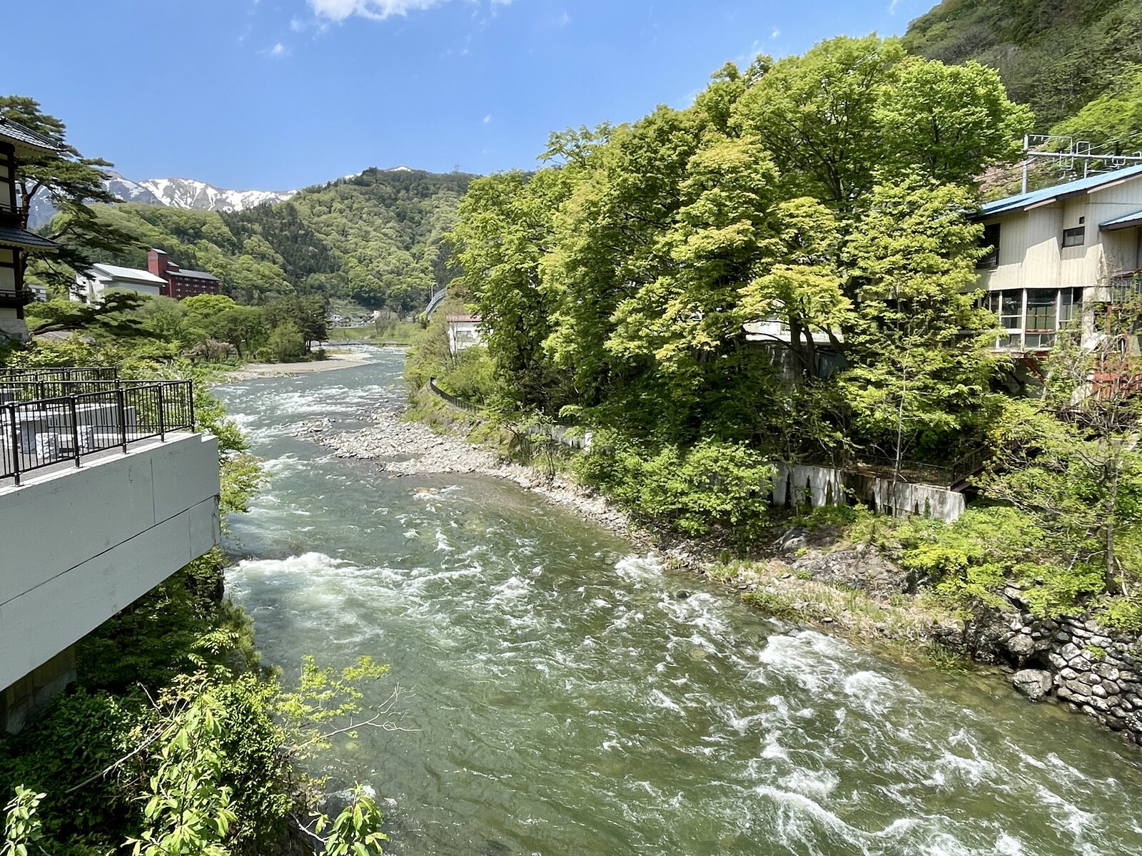 温泉街のすぐ横を流れる利根川。