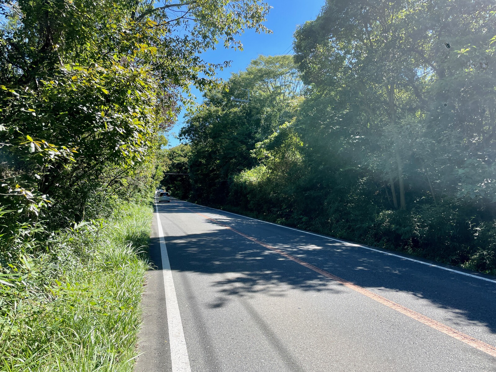 傾斜の緩い山道を多くの車が走り、