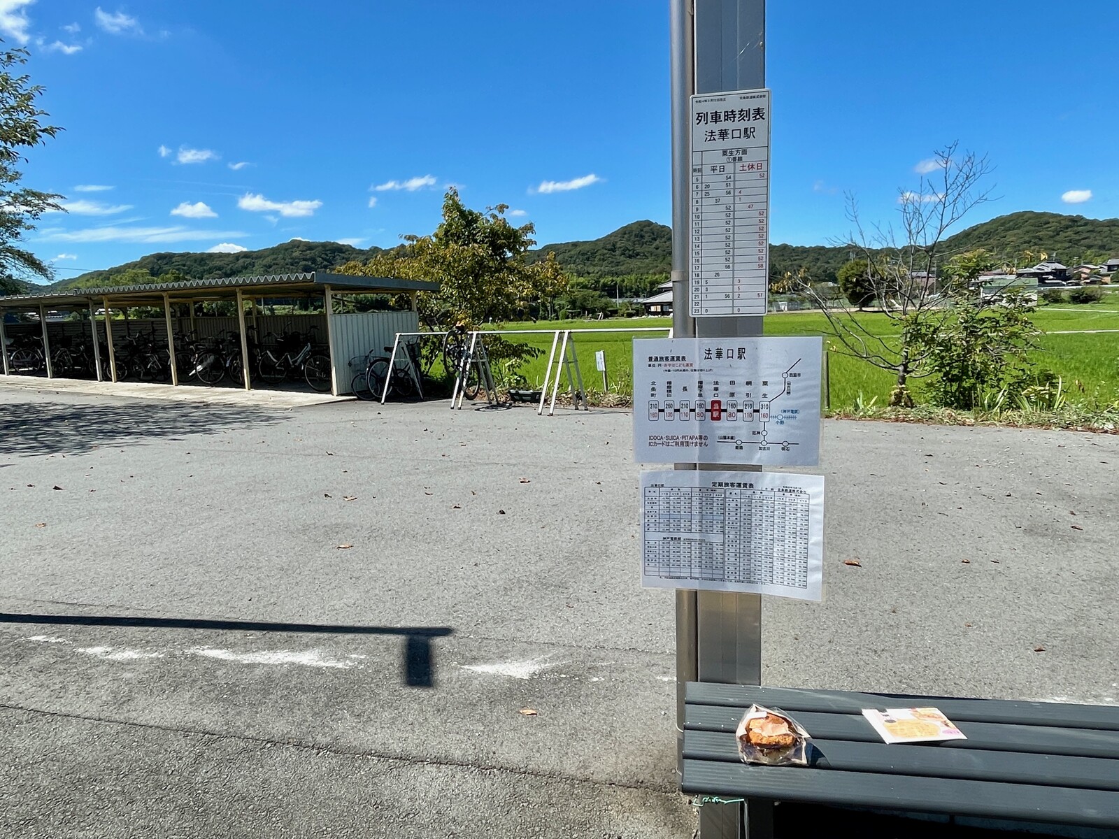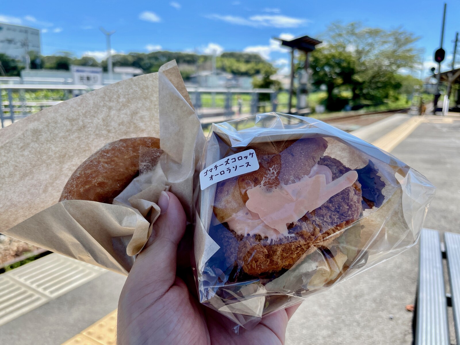 駅ホームでパンを頂きながら、