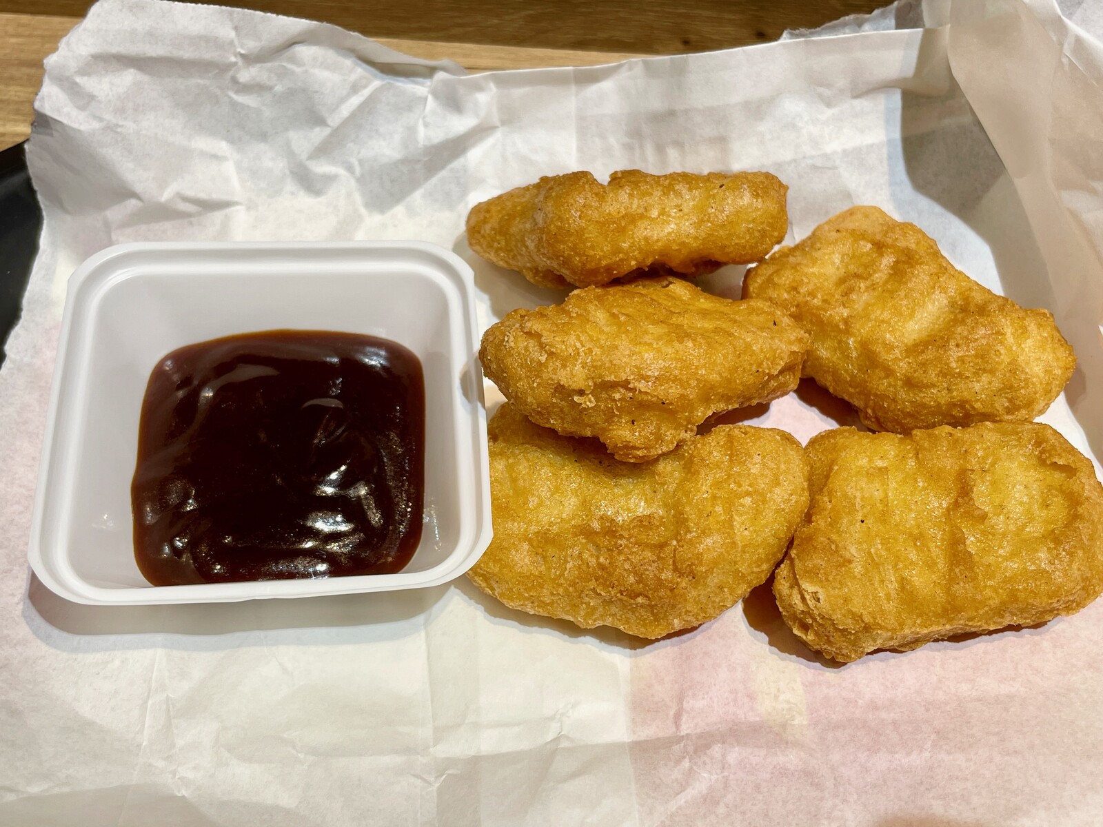 BBQソースをナゲットにつけて頂いて