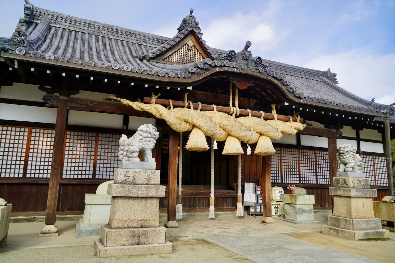 大きなしめ縄飾りある社殿で