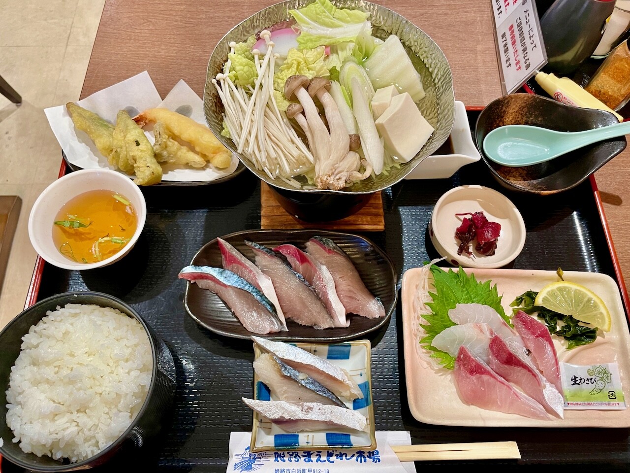 市場内の食堂でぼうぜ鯖御膳を注文。
