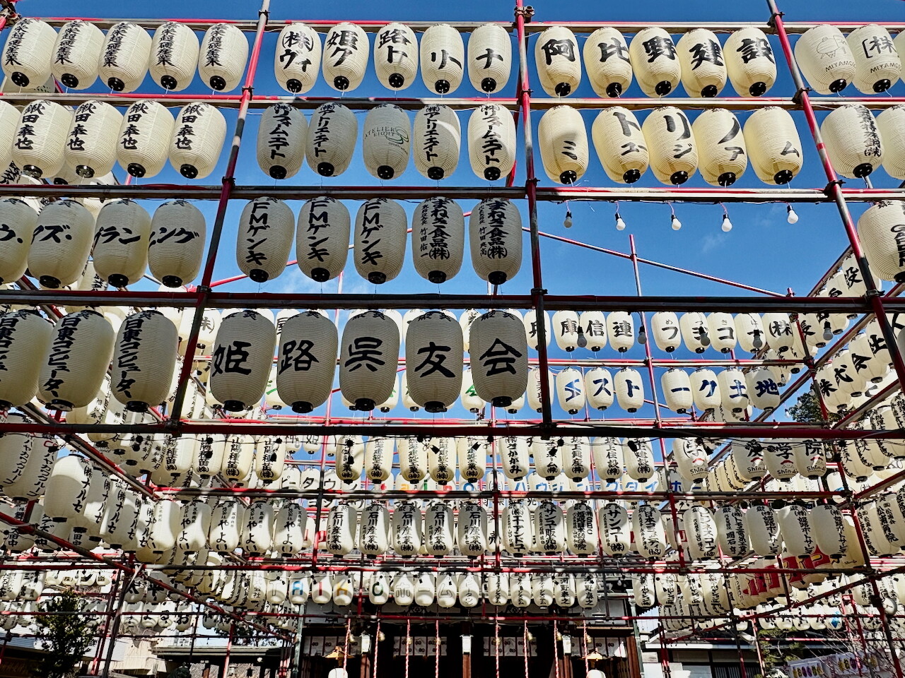 頭の上には沢山の提灯がずらっと。