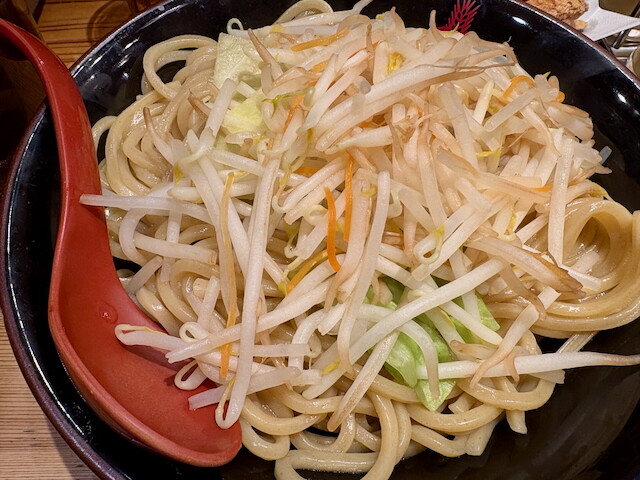 盛った野菜の下にある太麺をドロっとした