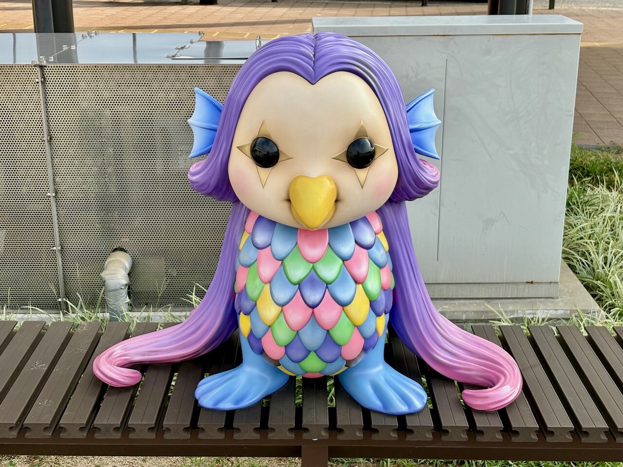 駅前のベンチには妖怪アマビエが。