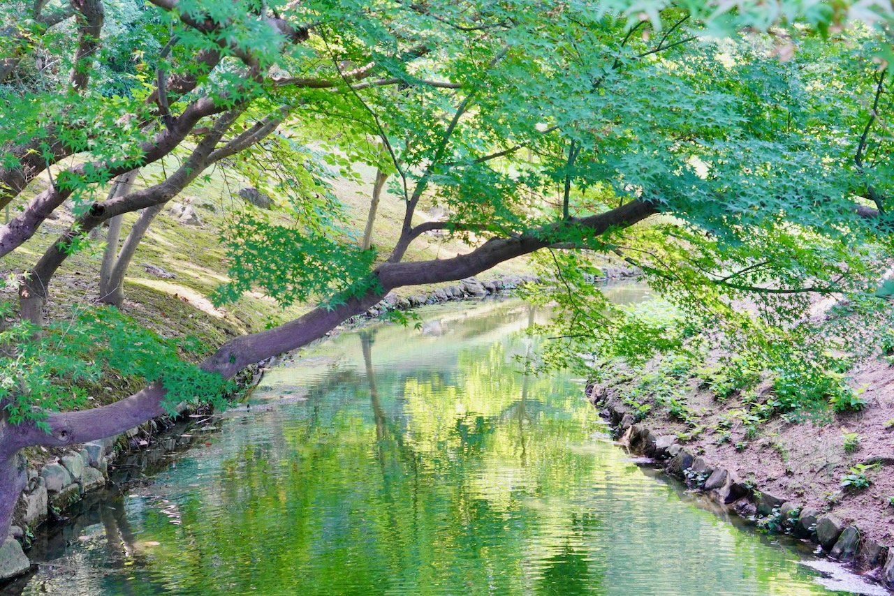 川を覆う木々の緑が映り込んでいて、